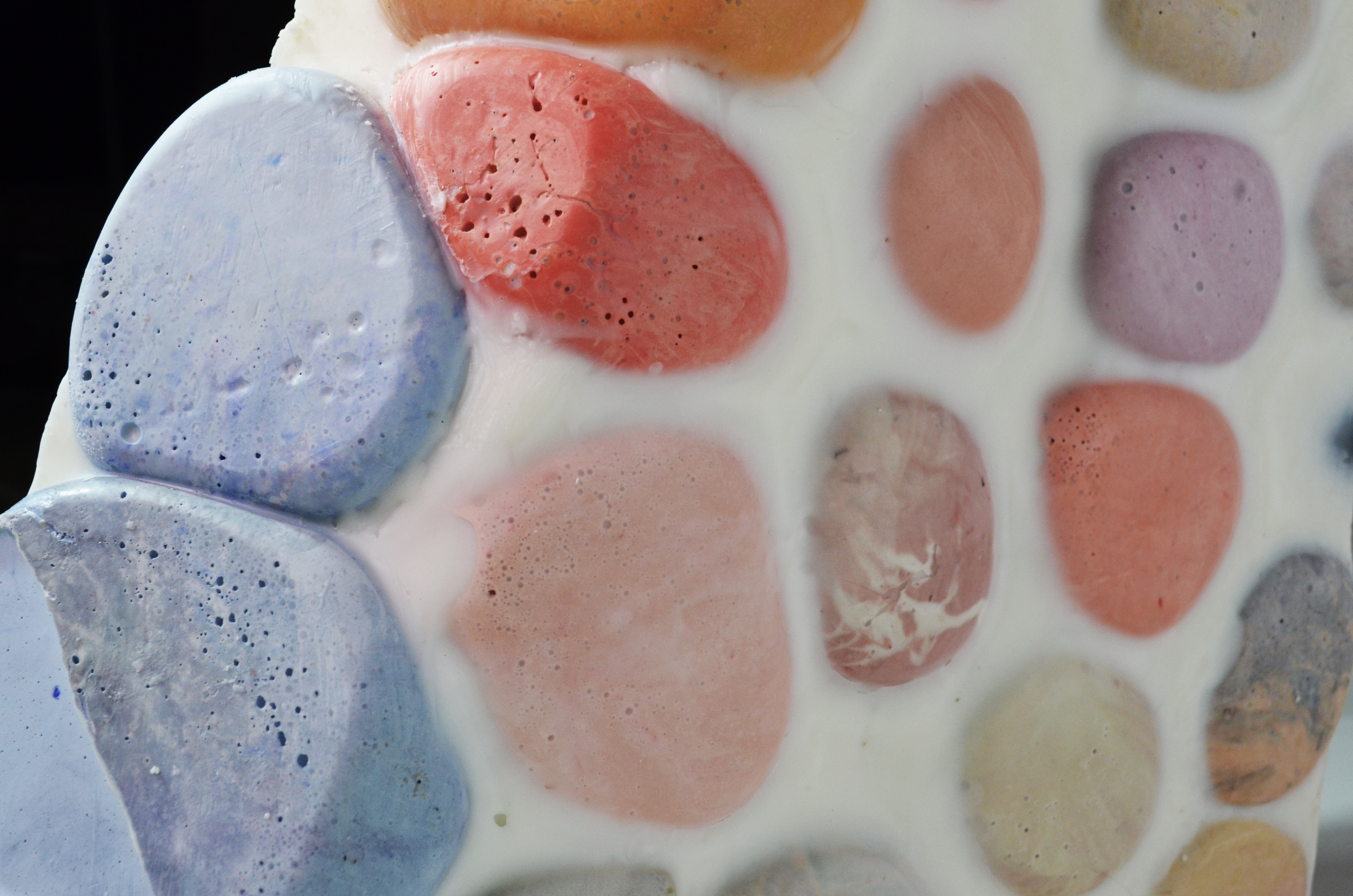 Dual-stage casting was used to create a voronoi-based masonry wall: Each colored gypsum-stone is formed by pressure from its neighbors and its unique position within the formwork.